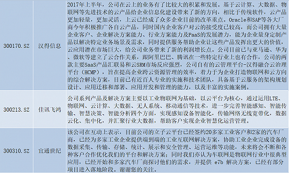 第四类是信息技术企业,它们发挥技术优势,将现有的物联网平台、大数据平台,向制造领域延伸,如高新兴(300098.SZ)、东方国信(300166.SZ)、佳讯飞鸿(300213.SZ)、宜通世纪(300310.SZ)、东土科技(300353.SZ)、光环新网(300383.SZ)、剑桥科技(603083.SH)、绿盟科技(300369.SZ)、天喻信息(300205.SZ)以及卫士通(002268.SZ)。
